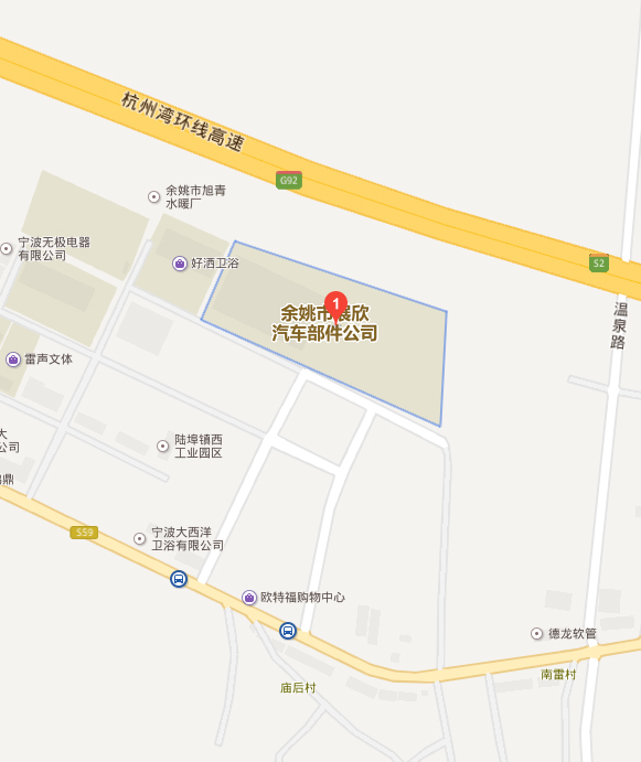 余姚市展欣汽車部件有限公司,地處寧(波)紹(興)平原中心,位于風(fēng)景秀麗的浙江省余姚市陸埠鎮(zhèn)西工業(yè)園區(qū)。緊靠杭甬高速和蕭甬鐵路,近臨杭州灣跨海大橋,距河姆渡遺址10公里,距寧波櫟社國際機場40公里,距杭州蕭山國際機場80公里,交通便捷。